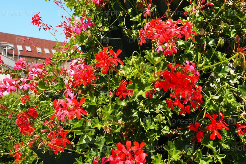Цветущая красная герань плющелистная пеларгония в вертикальном дизайне озеленения улиц и парков. Красивые большие цветы пеларгонии герани зеленые листья. Цветоводство и садоводство