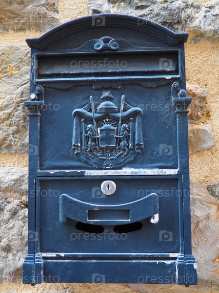 Винтажный красивый металлический почтовый ящик для писем в старинном декоративном стиле с тисненым гербом. Настенный ретро декор входа в дом. Железный ящик с облупившейся синей краской