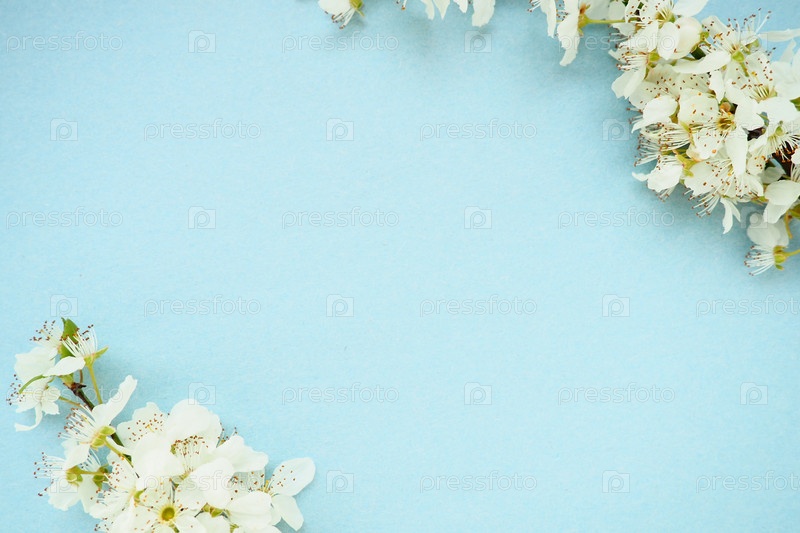 Белые цветы черемухи на синем фоне. Скопируйте место для текста. Яркая открытка на праздник или приглашение. Весеннее время