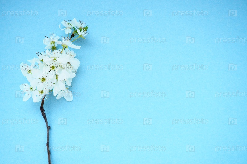 Белые цветы черемухи на синем фоне. Скопируйте место для текста. Яркая открытка на праздник или приглашение. Весеннее время