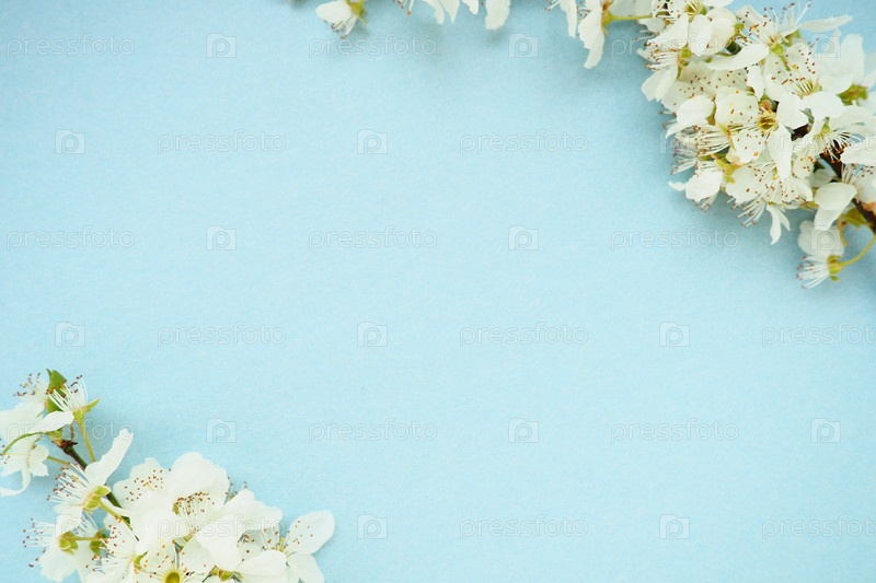 Белые цветы черемухи на синем фоне. Скопируйте место для текста. Яркая открытка на праздник или приглашение. Весеннее время