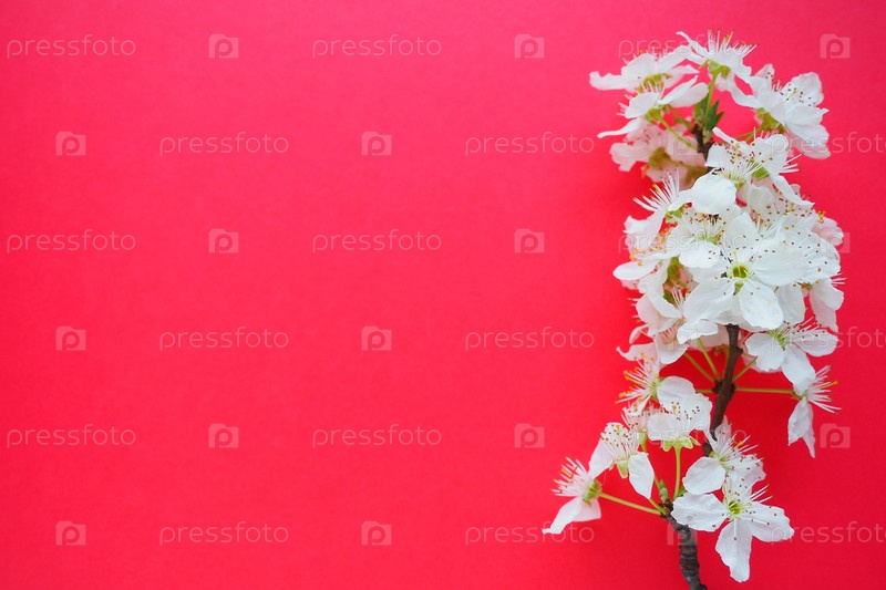 Белые цветы черемухи на красном фоне. Скопируйте место для текста. Яркая открытка на праздник или приглашение. Весеннее время