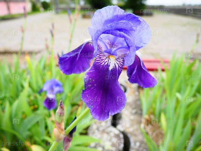Цветок ириса. Фиолетовый, голубой ирис. Семейство Ирисовые. Красивая городская клумба. Украшение сада, газона, зеленой зоны. Изысканные перевернутые лепестки цветка. Цветоводство как хобби