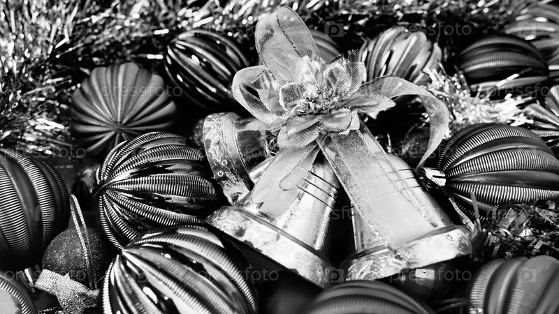 Новогодний фон с рождественскими украшениями, праздничными шарами, колокольчиками, бантами, дождем из елки. Черно-белое монохромное ретро-финальное горизонтальное фото. С новым годом и рождеством