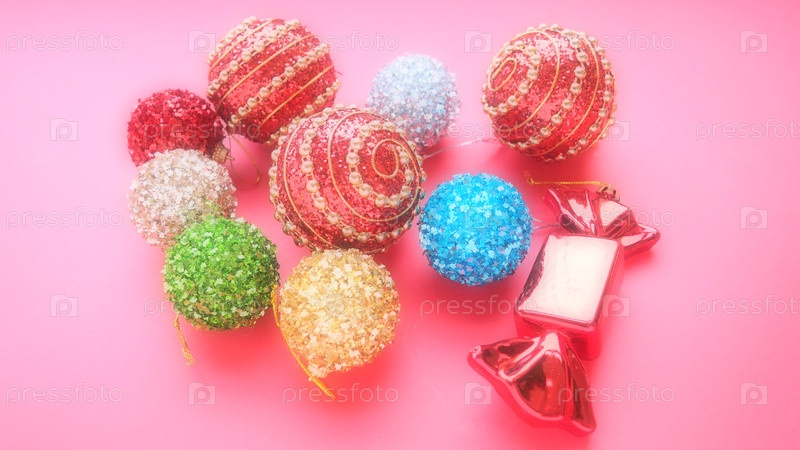 Новогодний фон с рождественскими украшениями, праздничными шарами, сладкими конфетами. С Новым годом и Рождеством. Красный, синий, полосатый, зеленый, золотой, желтый, серебряный красочный декор. Розовый фон