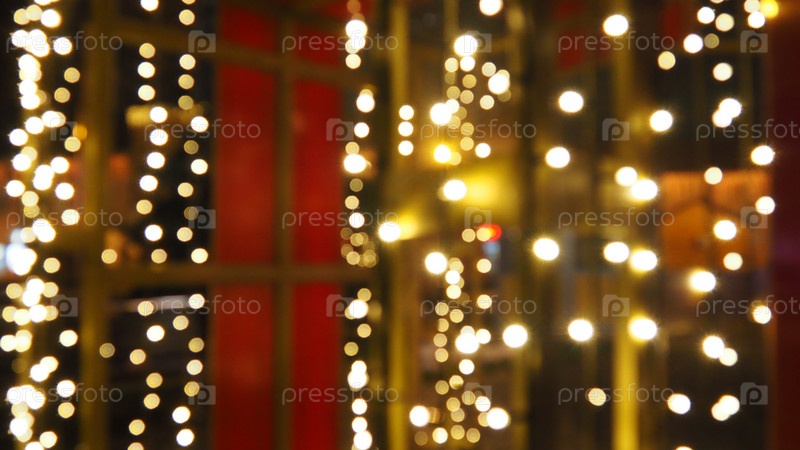 Боке в рождественскую ночь. Красивые круглые блики боке. Красный, желтый, золотой, белый цвета в темноте. Праздничный фон на Новый год с Рождеством. Размытый расфокус. Украшение городских улиц