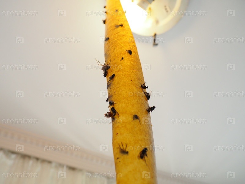 Липкая инсектицидная лента для защиты от ползающих и летающих насекомых, подвешенная под полотном рядом с лампой. Застрявшие и мертвые мухи, жуки, жуки и божьи коровки. Борьба с мухами на кухне