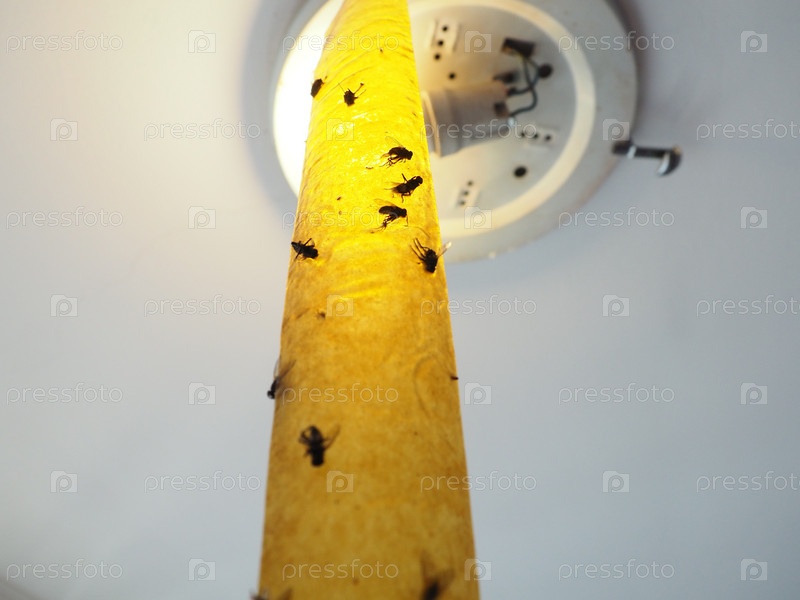 Липкая инсектицидная лента для защиты от ползающих и летающих насекомых, подвешенная под полотном рядом с лампой. Застрявшие и мертвые мухи, жуки, жуки и божьи коровки. Борьба с мухами на кухне