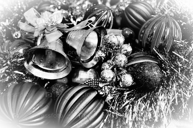 Новогодний фон с рождественскими украшениями, праздничными шарами, колокольчиками, бантами, рождественской мишурой. С Новым годом и Рождеством. Черно-белое монохромное фото. Ретро винтажный стиль. Белая виньетка