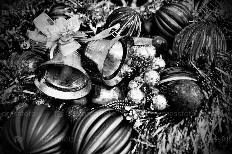 Новогодний фон с рождественскими украшениями, праздничными шарами, колокольчиками, бантами, рождественской мишурой. С Новым годом и Рождеством. Черно-белое монохромное фото. Ретро винтажный стиль. Темная виньетка