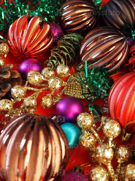Новогодний фон с рождественскими украшениями, праздничными шарами, колокольчиками, бантами, еловыми шишками, дождем из елки. С Новым годом и Рождеством. Красный, коричневый, полосатый, зеленый, золотой, фиолетовый красочный декор