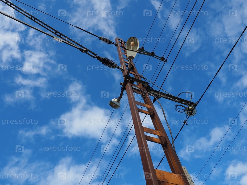 Опоры высокого напряжения против голубого неба и облаков. Столб с электричеством на вокзале. Электрические провода и оборудование для подачи электроэнергии