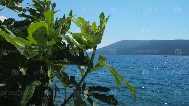 Герцег-Нови, Черногория, 13.08.2022 Фиговое дерево Ficus carica, субтропическое растение рода Ficus семейства тутовых. Корабли и лодки Адриатического моря. Волны и горы. Средиземноморский туристический бизнес