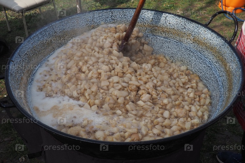 Перемешивание жира в большом чане на огне. Свиная шкура — кулинарный термин для кожи свиньи. Его можно тушить, жарить в жире, запекать, жарить для получения свиных шкварков или шкварков небольшими кусочками