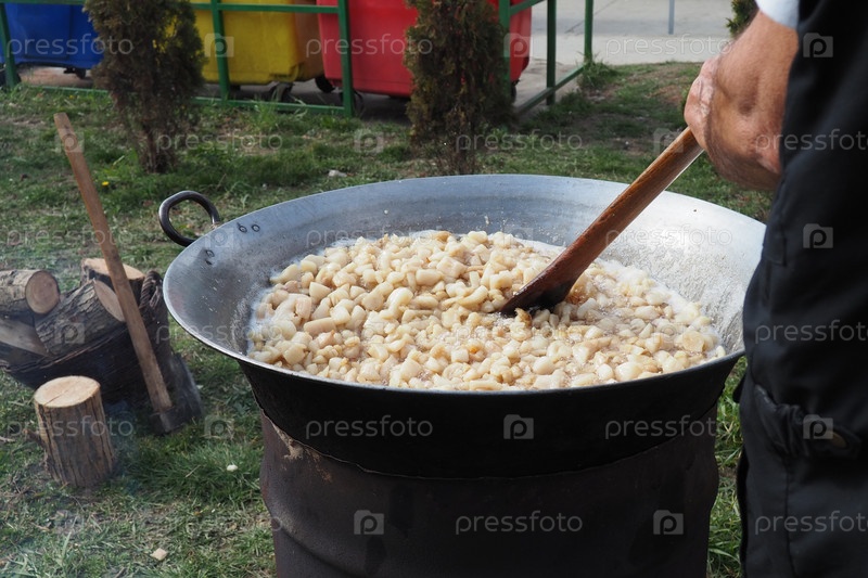 Перемешивание жира в большом чане на огне. Свиная шкура — кулинарный термин для кожи свиньи. Его можно тушить, жарить в жире, запекать, жарить для получения свиных шкварков или шкварков небольшими кусочками
