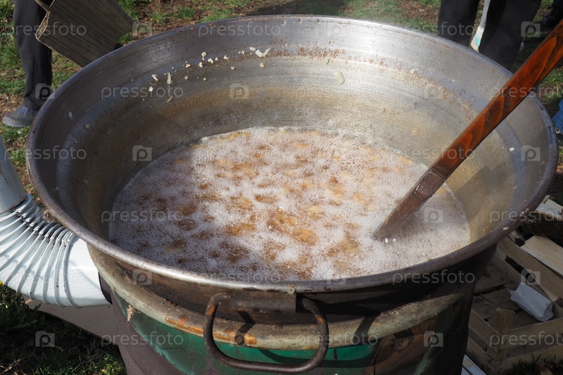 Перемешивание жира в большом чане на огне. Свиная шкура — кулинарный термин для кожи свиньи. Его можно тушить, жарить в жире, запекать, жарить для получения свиных шкварков или шкварков небольшими кусочками