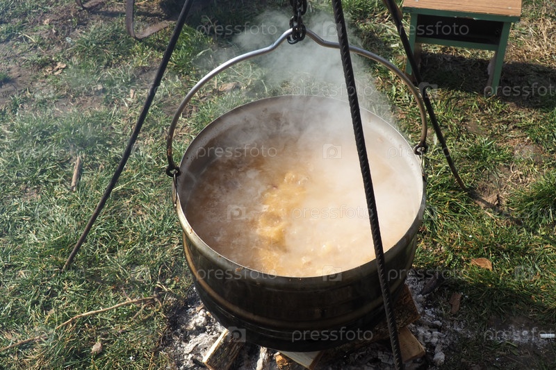 Приготовление традиционного сербского балканского блюда из квашеной капусты с копчеными свиными ребрышками и мясом. Большой чугунный котел. Вкусная еда булькает и готовится на углях. Овощи с мясом готовят на костре