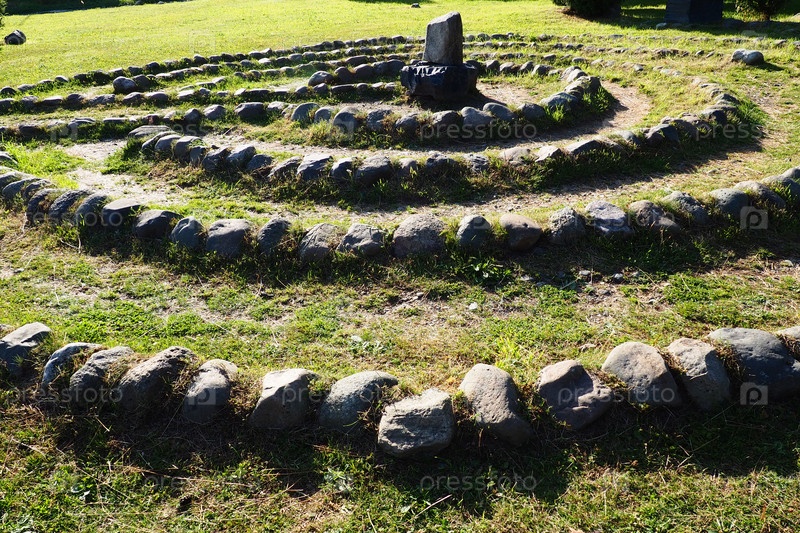 Каменный лабиринт у скалы Чертов Стул на Онежском озере. Заозерье, Петрозаводск, Карелия, Россия. Волшебное место для ритуалов древних карелов и финнов. Этнографический северный туризм