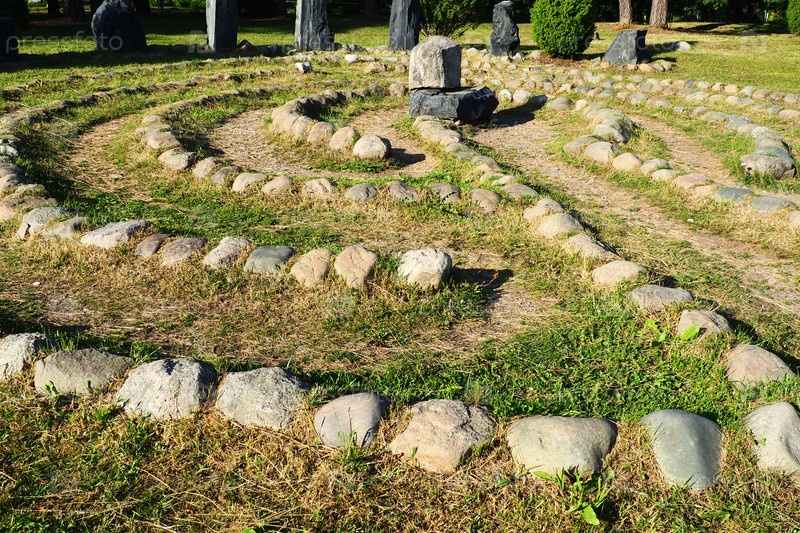 Каменный лабиринт у скалы Чертов Стул на Онежском озере. Заозерье, Петрозаводск, Карелия, Россия. Волшебное место для ритуалов древних карелов и финнов. Этнографический северный туризм