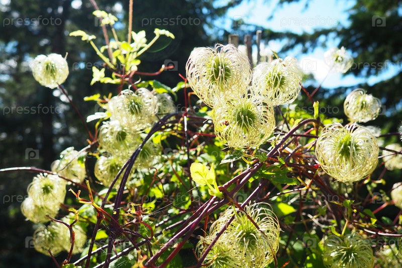 Клематис, радость путешественников, девственная беседка, старческая борода, кожаный цветок, ваза. Польский сорт. Тычинки состоят из желтых пыльников, расположенных на липовых нитях, а пестики светло-желтые