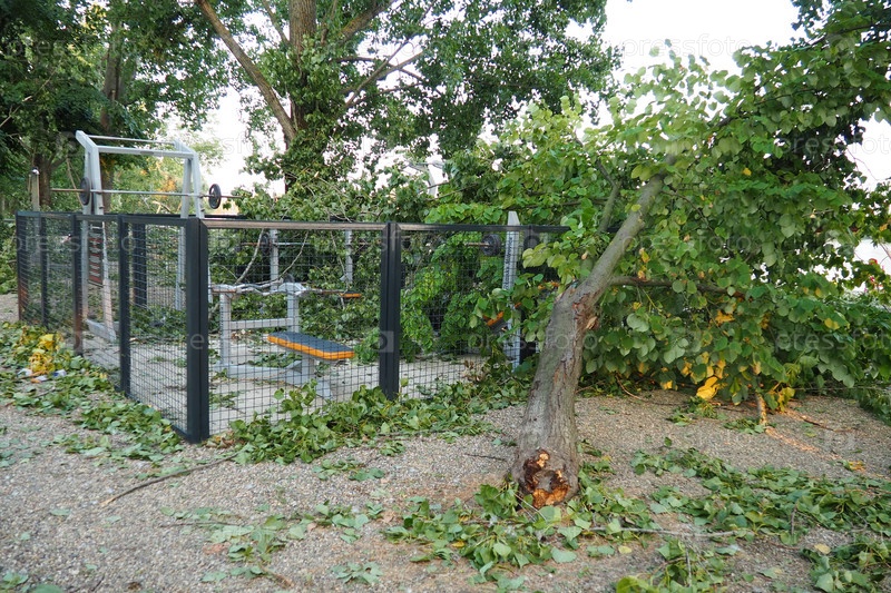 Последствия урагана 19 июля 2023 года, пляж Сремска-Митровица, Сербия. Сломанные деревья, бардак на улицах. Сломанные ветки, погнутый ствол. Чипсы и мусор. Чрезвычайное положение после катастрофического шторма