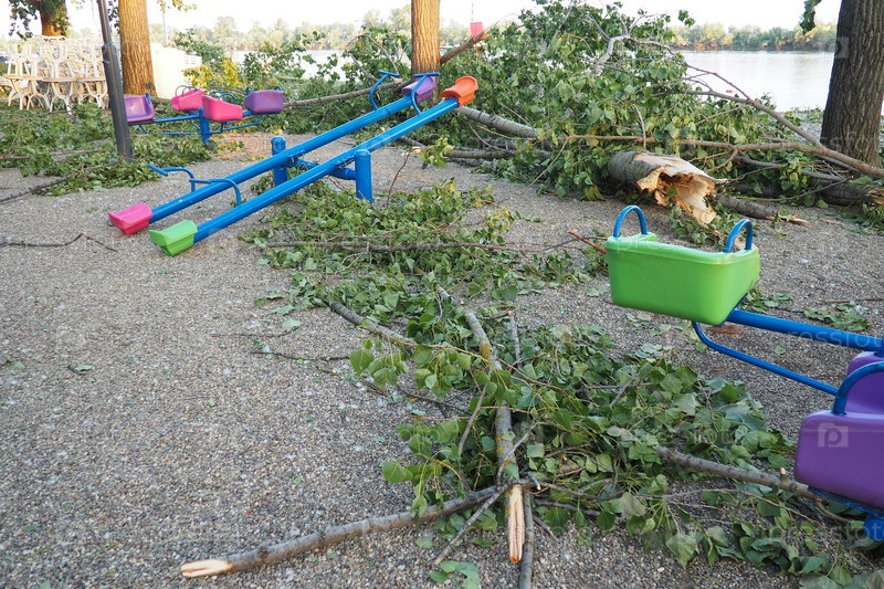 Последствия урагана 19 июля 2023 г. Сремска-Митровица, Сербия. Сломанные деревья, бардак на улицах. Сломанные ветки, погнутые стволы. Чипсы и мусор. Чрезвычайное положение после катастрофического шторма