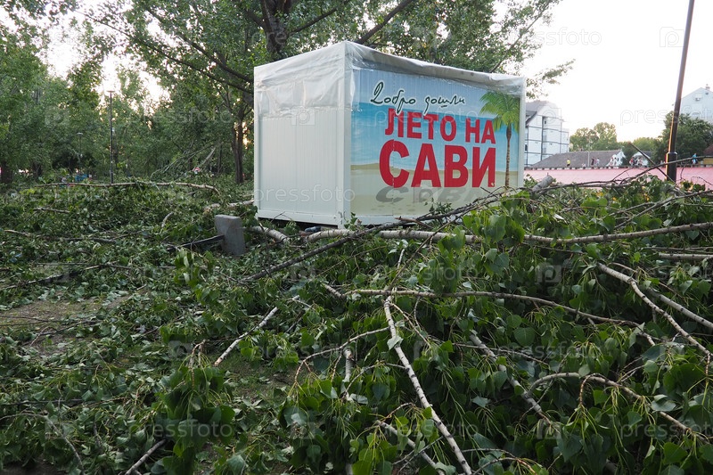 Последствия урагана 07,19,23 Сремска-Митровица, Сербия. Сломанные деревья, бардак на улицах. Сломанные ветки, погнутые стволы. Чипсы и мусор. Надпись - лето на реке Саве. Катастрофический шторм