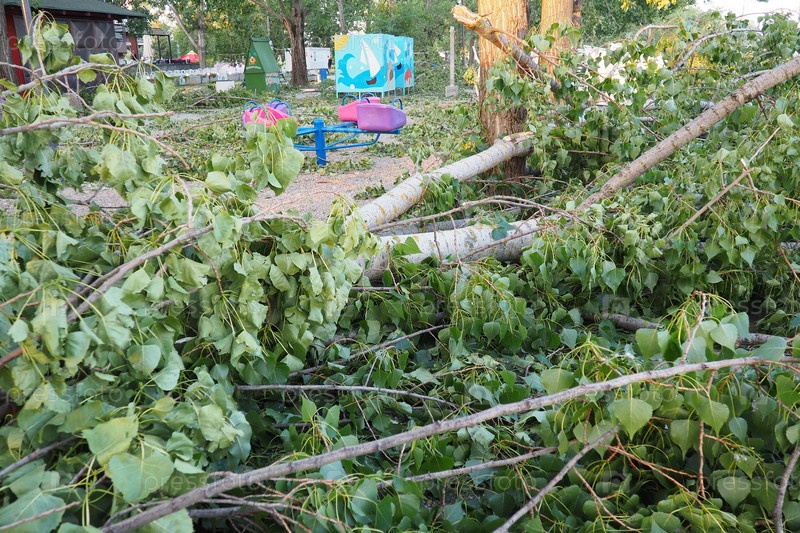 Последствия урагана 19 июля 2023 г. Сремска-Митровица, Сербия. Сломанные деревья, бардак на улицах. Сломанные ветки, погнутые стволы. Чипсы и мусор. Чрезвычайное положение после катастрофического шторма