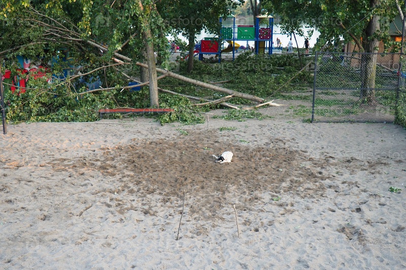 Последствия урагана 19 июля 2023 года, пляж Сремска-Митровица, Сербия. Сломанные деревья, бардак на улицах. Сломанные ветки, погнутый ствол. Чипсы и мусор. Чрезвычайное положение после катастрофического шторма