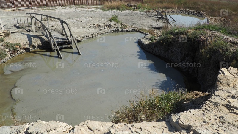 Кратер с серой вулканической лечебной глиной. Дыра с выдающейся аморфной массой из недр земли. Грязевое и газовое извержение. Темрюк. Поверхность почвы с трещинами. Текстура селевых трещин