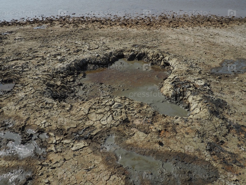 Кратер с серой вулканической лечебной глиной. Дыра с выдающейся аморфной массой из недр земли. Грязевое и газовое извержение. Темрюк, Россия. Поверхность почвы с трещинами. Текстура селевых трещин