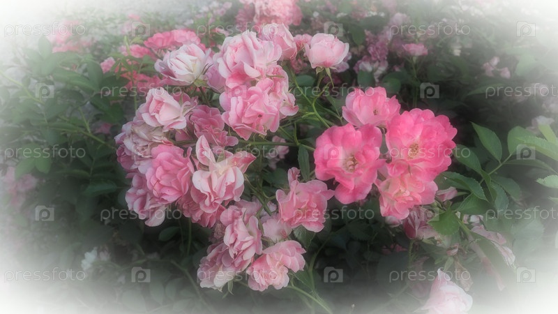 Брызги розовых роз. Красивые нежные цветы роз на фоне зеленых листьев, бутонов и шипов. Мягкое освещение. Мягкий фокус, туман или дымка. Открытка. Стрельба в золотой час