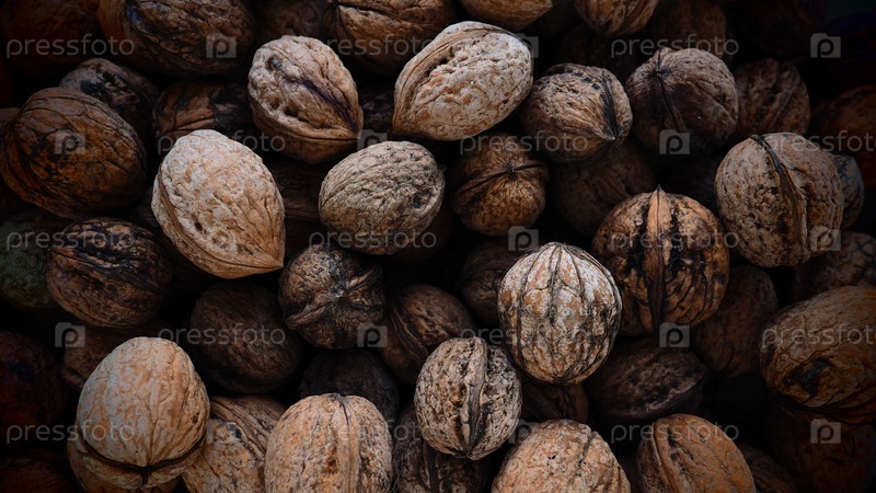 Много грецких орехов крупным планом. Неочищенные грецкие орехи со скорлупой. Куча орехов. фон. Вегетарианская здоровая диета. Полиненасыщенные жирные кислоты, омега-3
