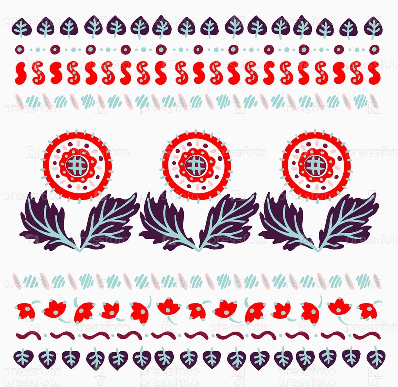 Набор этнических элементов. Бордюр представляет собой полосу с цветами, листьями, ветками, вензелями. Народная вышивка. Славянский, украинский, русский мотив. Хохлома, матрешка, дымковская игрушка. Мексиканский, индийский, цыганский ковер. Вязаное кружево