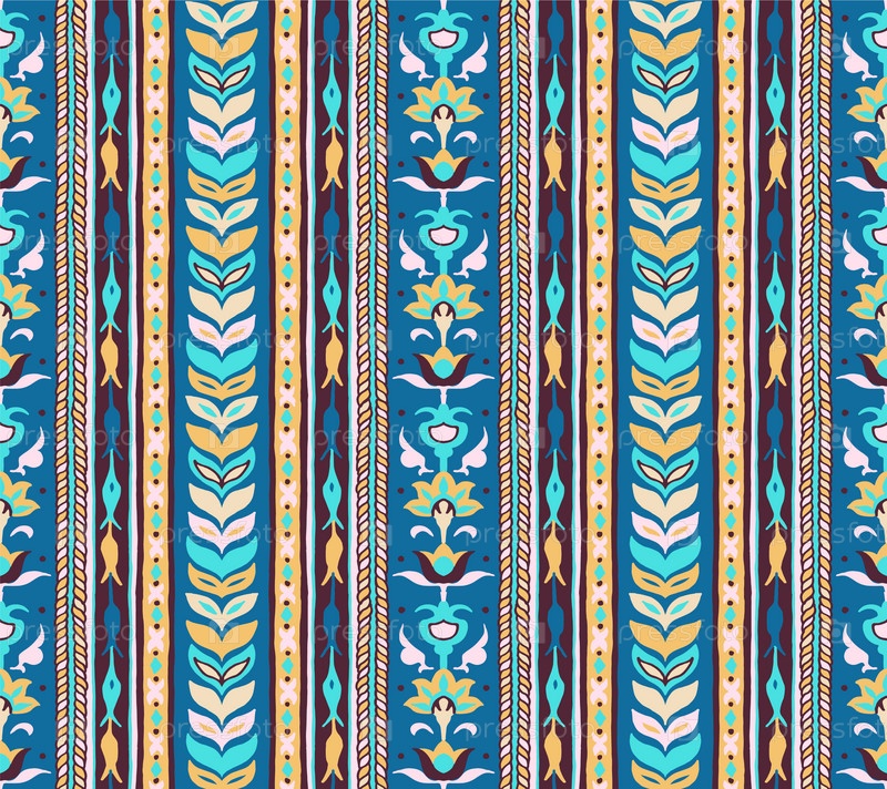 Геометрический дамасский орнамент. Икат границы. Этническая вышивка с листьями и монограммами. Племенная векторная текстура. Бесшовный народный узор в ацтекском стиле. Индийский, скандинавский, цыганский, мексиканский, африканский ковер