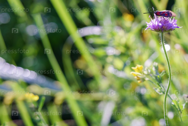 Открытка лето. Луговой цветок в траве. Жук на полевом цветке
