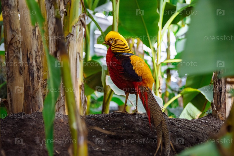 Самец золотого фазана стоит боком на холме в лесу в зеленых листьях с длинным хвостом