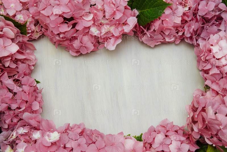 Рамка из розовых цветов гортензии на белом деревянном фоне крупным планом с пустым пространством для текста, пространство для копирования, плоская планировка, место для копирования, плоская планировка, концепция поздравительной открытки