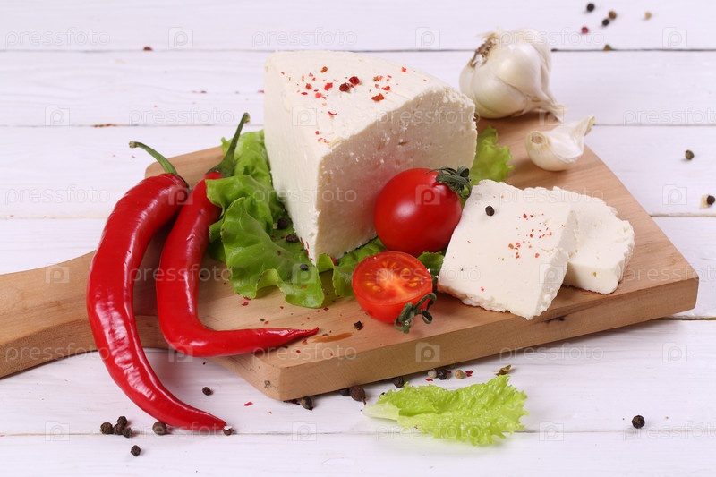 Адыгейский сыр с овощами на белом фоне