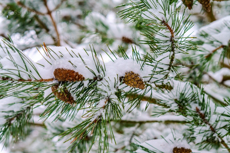 Еловая ветка в снегу. Зимний снег на ветвях и шишках