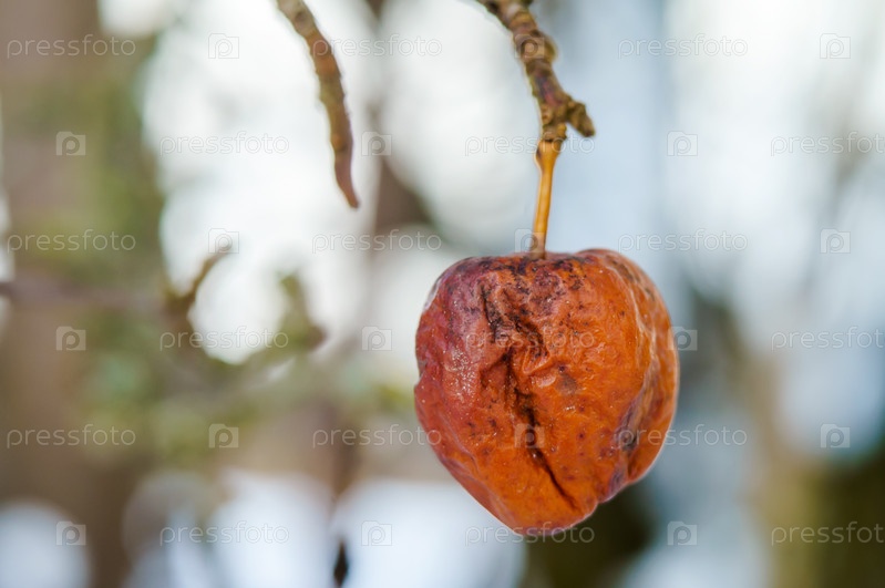 Яблоко на дереве. Яблоко морщинистое. Увядшее увядшее яблоко