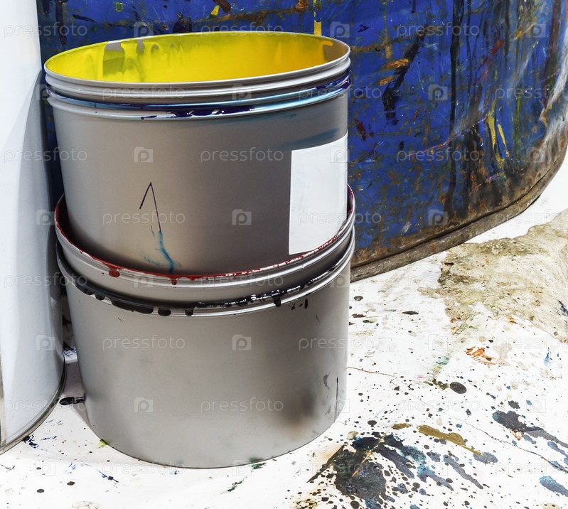 Краски в типографии. Ведро краски. Краски для печати в типографии