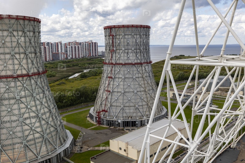 Россия. Санкт-Петербург. Вид на оборудование теплоэлектростанции. Градирни. Россия. Санкт-Петербург. Вид на оборудование ТЭС. Охлаждающие башни