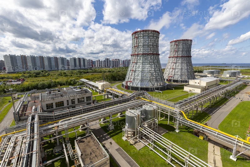 Россия. Санкт-Петербург. Вид на оборудование теплоэлектростанции. Градирни. Россия. Санкт-Петербург. Вид на оборудование ТЭС. Охлаждающие башни