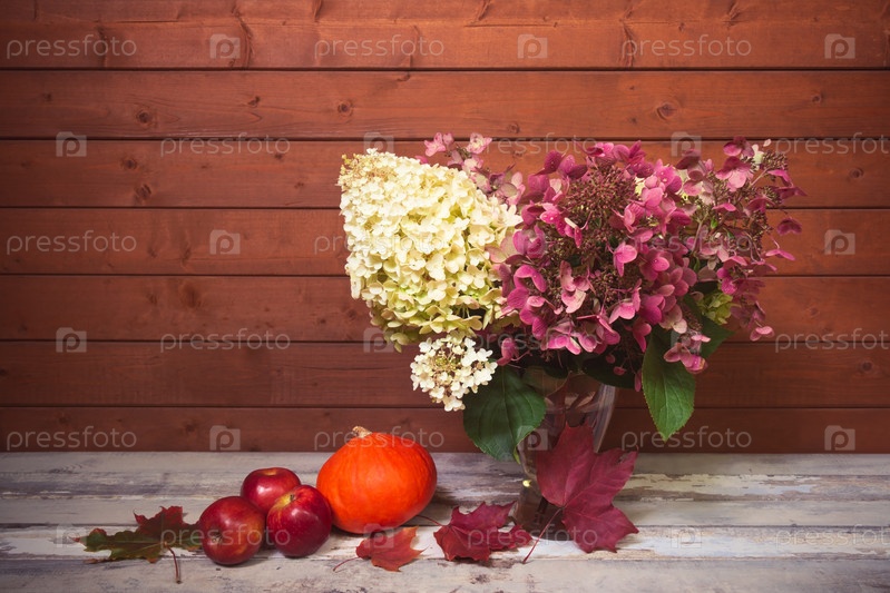 Осенние увядающие розовые и белые цветы гортензии, яблоки и тыква на состаренном деревянном столе. Просмотр с копией пространства