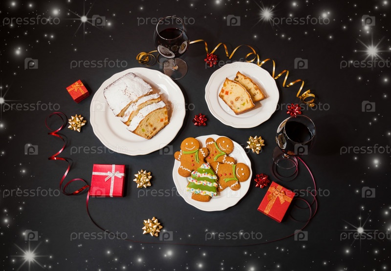 Рождественские пряники, рождественский торт с цукатами и изюмом, красное вино и подарки на темном фоне. Вид сверху