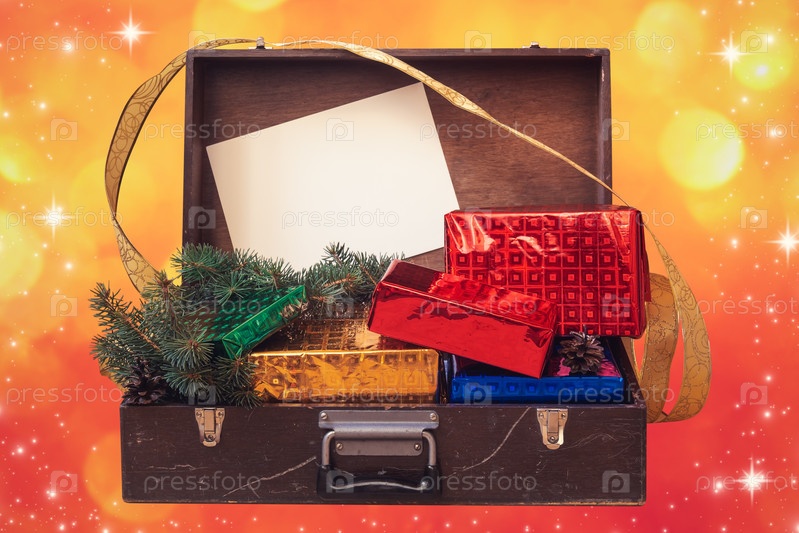 Старый чемодан с рождественскими подарками и пустой карточкой для вашего текста