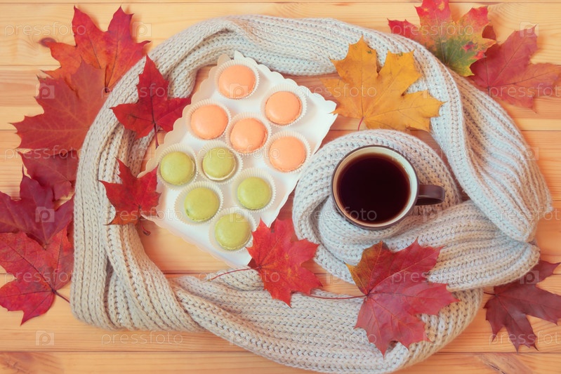 Кружка горячего кофе, коробка миндального печенья и красочные осенние кленовые листья на деревянном столе. Вид сверху