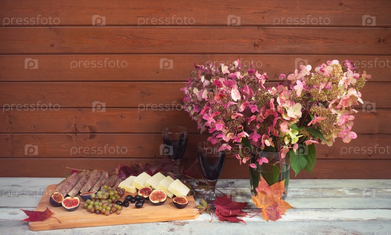 Осенние цветы гортензии, два бокала красного вина, инжир, сыр, виноград, хлеб и маслины на старом деревянном столе