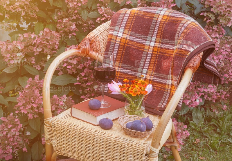 Бокал красного вина, книга, инжир и букет гелениума и осенних крокусов на плетеном стуле в саду